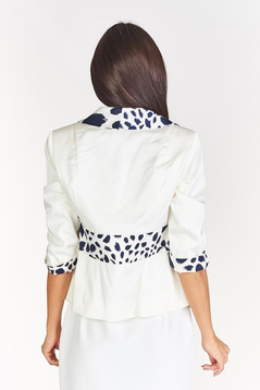 Szykuje się jakaś specjalna okazja, impreza rodzinna, wesele? Piękny żakiet -klasyka elegancji. Z charakterystycznym, kontrastowym wzorem. Kołnierz, mankiety i pas w geometryczny deseń. Bardzo elegancki wizytowy styl. Zapinany na dwa guziczki. Żakiet to Efektowny element naszej garderoby. W połączeniu z sukienką lub spódnicą możesz stworzyć szykowny powiew stylizacji na wiosnę/lato.