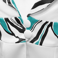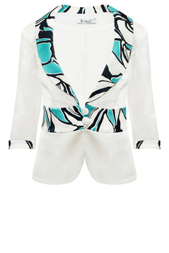 Szykuje się jakaś specjalna okazja, impreza rodzinna, wesele? Piękny żakiet -klasyka elegancji. Z charakterystycznym, kontrastowym wzorem. Kołnierz, mankiety i pas w geometryczny deseń. Bardzo elegancki wizytowy styl. Zapinany na dwa guziczki. Żakiet to Efektowny element naszej garderoby. W połączeniu z sukienką lub spódnicą możesz stworzyć szykowny powiew stylizacji na wiosnę/lato.