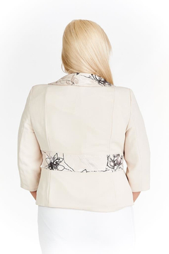 Szykuje się jakaś specjalna okazja, impreza rodzinna, wesele? Piękny żakiet -klasyka elegancji. Z charakterystycznym, kontrastowym wzorem. Kołnierz, mankiety i pas w geometryczny deseń. Bardzo elegancki wizytowy styl. Zapinany na dwa guziczki. Żakiet to Efektowny element naszej garderoby. W połączeniu z sukienką lub spódnicą możesz stworzyć szykowny powiew stylizacji na wiosnę/lato.