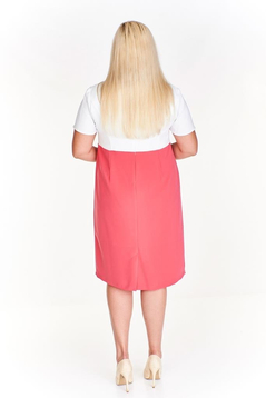 Sukienka prosta odcinana w pasie. Dekolt okrągły, podkreślony cięciem oraz kontrastowymi wypustkami. Na przodzie cięcia francuskie modelujące biust oraz talię. Sukienka z podszewką. Na środku tyłu suwak kryty oraz rozporek umożliwiający swobodne chodzenie.