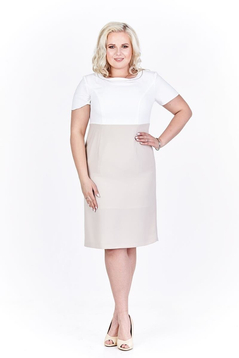 Sukienka prosta odcinana w pasie. Dekolt okrągły, podkreślony cięciem oraz kontrastowymi wypustkami. Na przodzie cięcia francuskie modelujące biust oraz talię. Sukienka z podszewką. Na środku tyłu suwak kryty oraz rozporek umożliwiający swobodne chodzenie.