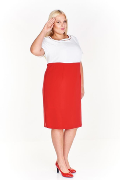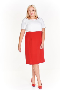 Sukienka prosta odcinana w pasie. Dekolt okrągły, podkreślony cięciem oraz kontrastowymi wypustkami. Na przodzie cięcia francuskie modelujące biust oraz talię. Sukienka z podszewką. Na środku tyłu suwak kryty oraz rozporek umożliwiający swobodne chodzenie.