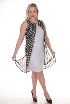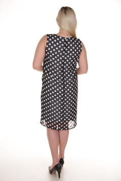 Dopasowana sukienka o prostym kroju, delikatnie taliowana, bez rękawów. Do całości przyszyta szyfonowa narzutka - wzór: małe lub duże kropki. Sukienka jest idealna na upały, ale również dobrze sprawdzi się na przeróżne okazje. Ze szpilkami stworzysz niebanalną stylizację. Skład: 65% Poliester; 32% Poliamid; 3% Elastan