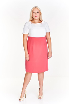 Sukienka prosta odcinana w pasie. Dekolt okrągły, podkreślony cięciem oraz kontrastowymi wypustkami. Na przodzie cięcia francuskie modelujące biust oraz talię. Sukienka z podszewką. Na środku tyłu suwak kryty oraz rozporek umożliwiający swobodne chodzenie.