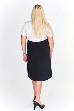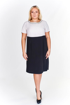 Sukienka prosta odcinana w pasie. Dekolt okrągły, podkreślony cięciem oraz kontrastowymi wypustkami. Na przodzie cięcia francuskie modelujące biust oraz talię. Sukienka z podszewką. Na środku tyłu suwak kryty oraz rozporek umożliwiający swobodne chodzenie.