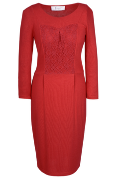 Klasyczna, dopasowana, ołówkowa sukienka. Dekolt okrągły. Rękaw o długości 3/4. Sukienka została uszyta z bardzo miłej w dotyku, sweterkowej dzianiny. Na środku przodu została naszyta bawełniana koronka. Skład surowcowy: 63% wiskoza, 25% poliester, 7% nylon, 5% lycra. Materiał jest bardzo elastyczny, dlatego nie zastosowano suwaka. Nie ma również podszewki. Sukienka powstała z myślą o kobietach w każdym wieku. Jeśli chcesz wyglądać modnie i efektownie, oraz czuć się komfortowo, to ta sukienka jest właśnie dla Ciebie. Sukienkę polecamy na co dzień, np. do pracy biurowej, ale przy odpowiednim doborze dodatków, sprawdzi się również na kameralnych przyjęciach.