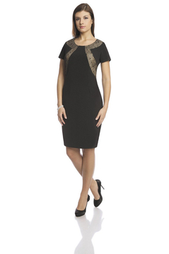 Klasyczna, prosta sukienka z krótkim rękawem. Materiał zasadniczy: miękka, zwiewna tkanina: krepa. Wstawki: ozdobna siateczka, naszyta na gładki, w kolorze beżowym materiał. Z przodu: wstawki, standardowe zaszewki. Z tyłu na środku: kryty suwak, na dole rozcięcie, po bokach zaszewki. Bardzo wygodna, nie krępująca ruchów, lekka. Uniwersalna, idealna na rodzinne oraz służbowe spotkania, wesela, komunie i różne imprezy okolicznościowe. Polecamy kobietom dojrzałym.
