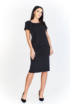 Sukienka z krótkim rękawem, z miękkiej, nie gniecącej się nadmiernie tkaniny. Cięcia francuskie. Z tyłu na środku: kryty suwak, na dole rozcięcie. Na przodzie fantazyjnie upięty materiał przy dekolcie, ułożony w zakładkę oraz puszczony luźno z prawej strony dekoltu. Rękawy wywinięte, kształt wywinięcia przypominający kołnierzyk, z niedużym guzikiem na środku. Bardzo wygodna, nie krępująca ruchów. Idealna dla kobiet w każdym wieku, uniwersalna: do pracy biurowej, na służbowe lub rodzinne spotkania, jak również wesela, komunie czy inne imprezy okolicznościowe.