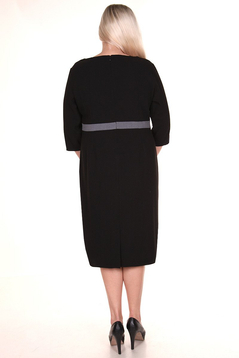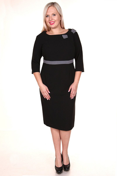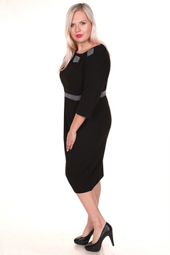 Klasyczna dopasowana sukienka. Z lewej strony przy szyi wszyta ozdobna kokardka. Cięcia piersiowe przebiegają od pasa do dekoltu. Tył prosty, z zaszewkami i suwakiem krytym na środku pleców. Na dole zakładany rozporek. W pasie kontrastowy pasek akcentujący talię. Rękaw o długości ¾. Sukienka została uszyta z elastycznej, miłej w dotyku tkaniny, nie ulegającej nadmiernemu gnieceniu. Doskonała do codziennej pracy biurowej, ale w połączeniu z bogatą biżuterią zyska uznanie również na rodzinnych uroczystościach takich jak: wesele, komunia, jubileusz.