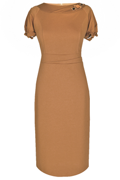 Klasyczna, dopasowana, ołówkowa sukienka. Dekolt okrągły, asymetryczny podkreślony ozdobną aplikacją. Rękaw krótki reglan, na dole wykończony gumką, tworzącą marszczenie. Na przodzie cięcia modelujące biust. W talii asymetryczny pasek z dużą zakładką. Suwak kryty z tyłu, rozporek na dole ułatwiający swobodne stawianie kroków. Bez podszewki. Sukienka została uszyta z rozciągliwej dzianiny. Nie ulega gnieceniu, jest przyjemna w dotyku. Sukienkę polecamy na co dzień do pracy biurowej, ale nie tylko. Przybrana odpowiednią biżuterią sprawdzi się również na prywatnych spotkaniach, i wielu innych wydarzeniach.