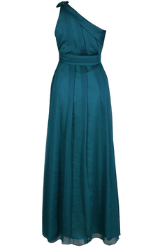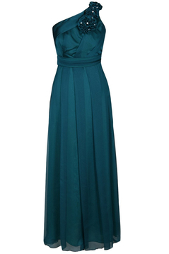 Asymetryczna, rozkloszowana, maxi sukienka, wzbudzająca podziw dosłownie wszystkich. Uszyta z dwutonowego szyfonu. Jest to niezwykle wyrafinowana tkanina. Przezroczysta, w dotyku bardzo delikatna, przypominająca szyfon jedwabny. Jest podszewka. Zakładana na jedno ramie, dołączone jest zapasowe cienkie ramiączko, które można doszyć do sukienki lub wykorzystać do biustonosza, zamiast niezbyt eleganckiego silikonowego. Talia zaakcentowana paskiem. Na przodzie i tyle zarówno na karczku jak i pod paskiem są szerokie miękko układające się zakładki. Charakteru dodają 3 bogate, różnej wielkości kwiaty, uszyte z tego samego materiału, dodatkowo ozdobione perełkami. Suwak kryty z boku. Jeśli chcesz zostać królową wieczoru, ta sukienka jest dla Ciebie. Polecamy na wesele, studniówkę lub Sylwestra.