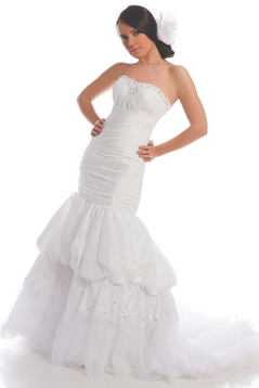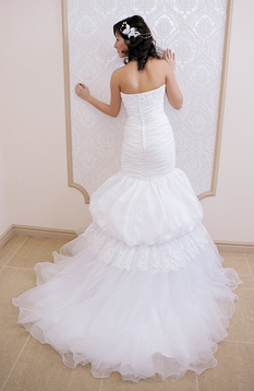 Suknia ślubna. Połączenie trzech materiałów: tafty, koronki oraz organzy. Krój sukni - rybka: dopasowany w biodrach, niżej rozkloszowany. Dopinane ramiączka. Na biuście ozdobna draperia, cekiny, kamienie. Usztywniane miseczki. Poniżej biustu- do ud, poziome zakładki. Na rozkloszowanym dole: warstwa tafty, koronka z cekinami i koralikami, falbany z organzy. Tiulowe, marszczone falbany również pod spodem, na podszewce. Suknia posiada podpinany na zatrzaski tren. Plecy częściowo odkryte. Kamienie, koraliki, cekiny również przy dekolcie z tyłu. Z tyłu zwykły suwak ukryty pod zakładką z tkaniny + ozdobne guziki.