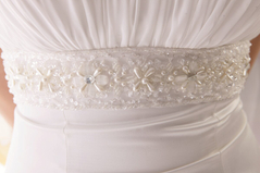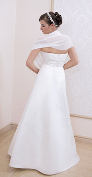 Zestaw: suknia ślubna + szal. Suknia została uszyta z grubej satyny, natomiast szal- z szyfonu. Suknia rozkloszowana, w kształcie litery A. Z przodu i z tyłu na karczku marszczenia. Usztywniane miseczki. Fiszbiny: na biuście, z boku i z tyłu. Pod biustem ozdobny pasek z cekinów, oraz kamieni - naszyty na materiał zasadniczy. Pod biustem cięcia pionowe: z przodu i z tyłu. Dół wykończony podszewką. Na podszewkę naszyta warstwa marszczonego tiulu. Zapięcie: zwykły suwak na środku tyłu, ukryty pod materiałem. Dodatkowo od środka gumka zapinana na haftkę, pozwalająca na dokładne dopasować sukienkę. Sukienka zawiera dodatkowo dopinane na zatrzaski ramiączka.