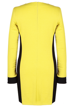 Tunika uszyta z kolorowej dzianiny o nazwie Punto, oraz kontrastowej czarnej tkaniny. Dekolt okrągły. Na przodzie pod szyją znajdują się oryginalne cięcia, imitujące kołnierzyk. Na biuście zaszewki piersiowe. Wstawki boczne znajdują się zarówno na przodzie jak i na tyle, znacznie wyszczuplają sylwetkę. Rękaw długi z mankietem o szerokości 5 cm. Z tyłu suwak kryty ułatwiający zakładanie. Materiały użyte do produkcji nie gniotą się. Tunika świetnie się prezentuje w zestawieniu z wąskimi spodniami lub legginsami.