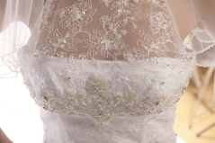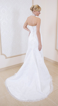 Suknia ślubna z trenem. W zestawie szal z satyny podwójnie odszyty. Sukienka z satyny o średniej grubości, cała pokryta koronką. Na koronce ozdoby, koraliki i cekiny. Kształt sukni- rybka: dopasowana w biodrach, niżej rozkloszowana. Usztywniane miseczki. Na biuście haft koralikowy (koraliki mienią się na złoto). Powyżej biustu sama koronka (bez spodniej warstwy satyny), zakładana na szyję, zapinana z tyłu na guziki. Z tyłu zwykły suwak ukryty pod zakładką z ozdobnymi guzikami. Częściowo odkryte plecy. Z tyłu krawędź dekoltu obszyta koralikami.