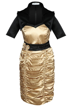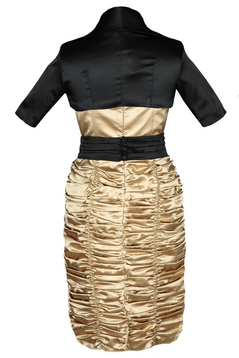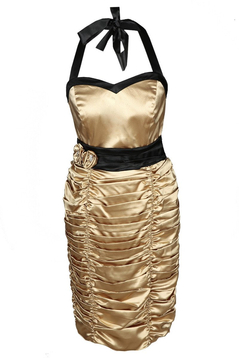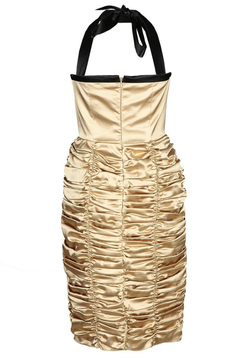 Wizytowa sukienka. Model uszyty został z satyny. Jest to delikatnie elastyczna tkanina z połyskiem. Bardzo miła w dotyku. Zawiązywana na szyi. Dekolt sercowe karo. Sukienka jest dopasowana. Odcięta w talii. Pasek zapinany na małe guziczki. Dół bardzo marszczony, tworzą się poziome fale. Z tyłu suwak kryty, oraz niewielkie pęknięcie ułatwiające chodzenie. W komplecie brak bolerka. Sukieneczka idealna na różnego rodzaju uroczyste wyjścia, np. wesela, komunie i wiele innych okazji.