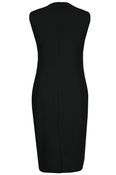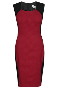 Sukienka ołówkowa. Materiałem zasadniczym jest tkanina stabilna, natomiast środek przodu to bardzo elastyczna i miła w dotyku strukturalna dzianina. Materiały użyte do produkcji nie ulegają gnieceniu i mechaceniu. Dekolt okrągły. Bez rękawów. Przód bardzo ładnie wymodelowany, pionowe cięcia wyszczuplają sylwetkę i podkreślają kobiece kształty. Z tyłu suwak kryty oraz rozporek na dole, pozwalający na swobodne chodzenie. Bez podszewki. Dół wykończony ściegiem krytym. Sukienka powstała z myślą o kobietach ceniących elegancki wygląd. Idealna na kameralne spotkania w gronie rodziny czy znajomych.