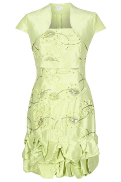 Cudowna, kobieca sukienka o fasonie bombki. Długość mini pięknie eksponuje nogi. Połyskliwy materiał plus cekinowe zdobienia nadają jej wieczorowego charakteru. Dodatkowym atutem jest bolerko w komplecie okrywające ramiona. Sukienka sprawdzi się na nadchodzące studniówki, wesela czy bale karnawałowe.