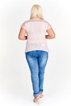Luźna bluzka, uszyta z dzianiny sweterkowej w połączeniu z bawełnianą koronką. Dekolt szpiczasty wykończony wypustką. Rękaw kimono. Na przodzie z lewej strony naszyta kieszonka. Boki nieco wydłużone, sprawiają że sylwetka wydaje się być smuklejsza. Bluzka idealna na wiosnę oraz chłodniejsze dni latem. W połączeniu z wąskimi spodniami wygląda zachwycająco.