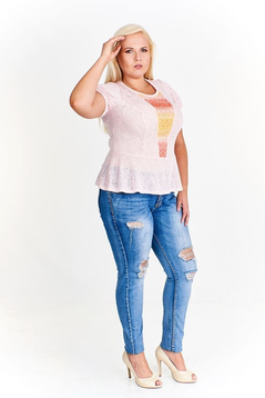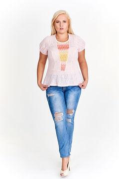 Bluzka z baskinką, uszyta została z dzianiny swetrowej, bardzo rozciągliwej. Z przodu cięcia francuskie. Na środku wstawka w postaci cieniowanej koronki ozdobiona perełkami. Rękaw krótki, marszczony na dole, wykończony mankietem. Tył prosty, z zaszewkami. Bluzka idealna na wiosnę. W połączeniu z dżinsami lub prostą ołówkową spódnicą tworzy bardzo udaną stylizację.