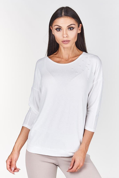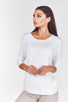Klasyczna, cienka bluzka z 3\4 rękawem, dekolt pod szyję. Idealna pod marynarkę, w zestawieniu ze spódnicą tworzy idealną stylizację. Doskonale sprawdzi się jako codzienna bluzka. Plecy zabudowane, prosty fason, na przodzie ozdobne perełki, które dodają bluzeczce uroku. Wykonana w 91% z wiskozy i 9% z elastanu. Nie mechaci się. Przyjemna w dotyku. Jest uniwersalna, przez co sprawdzi się dla kobiet w każdym wieku.