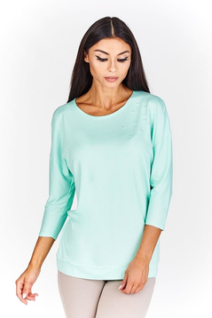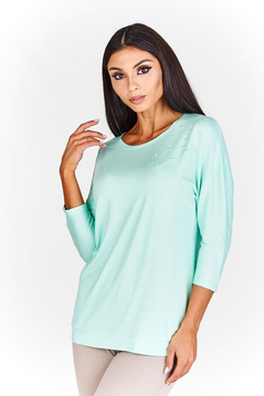 Klasyczna, cienka bluzka z 3\4 rękawem, dekolt pod szyję. Idealna pod marynarkę, w zestawieniu ze spódnicą tworzy idealną stylizację. Doskonale sprawdzi się jako codzienna bluzka. Plecy zabudowane, prosty fason, na przodzie ozdobne perełki, które dodają bluzeczce uroku. Wykonana w 91% z wiskozy i 9% z elastanu. Nie mechaci się. Przyjemna w dotyku. Jest uniwersalna, przez co sprawdzi się dla kobiet w każdym wieku.