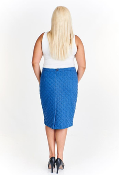 Klasyczna, ołówkowa spódnica. W tali pasek o szerokości 3 cm, zapinany z tyłu na 1 guzik. Suwak kryty. Na dole rozporek zakładany, ułatwiający chodzenie. Uszyta ze stabilnej tkaniny. Jest podszewka. Dół podszyty ściegiem krytym. Bardzo uniwersalna spódnica, w zależności od pozostałych części garderoby, może mieć szerokie zastosowanie, np. w połączeniu z białą bluzką tworzy strój wizytowy, w zestawieniu z gładkim golfem – odpowiedni ubiór do pracy.