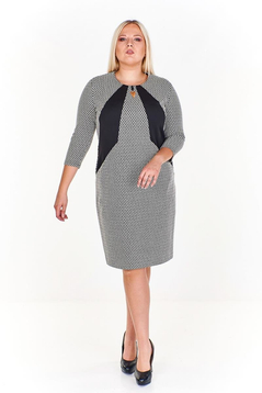 Prosta jesienna sukienka. Rękaw ¾. Dekolt okrągły. Przód fantazyjne pocięty, zaakcentowany kontrastową wstawką i pozłacaną ozdobą. Na przodzie w szwach, ukryte zostały kieszenie. Sukienka uszyta z bardzo miłej w dotyku, elastycznej dzianiny. Skład surowcowy: 64% poliamid, 31% wiskoza, 5% elastan. Materiał posiada delikatną strukturę. Z tyłu suwak kryty, na dole rozporek ułatwiający swobodne chodzenie. Bez podszewki. Sukieneczkę polecamy kobietom w każdym wieku, na co dzień do pracy biurowej, lub na kameralne spotkania w gronie rodziny czy przyjaciół.