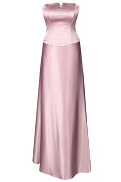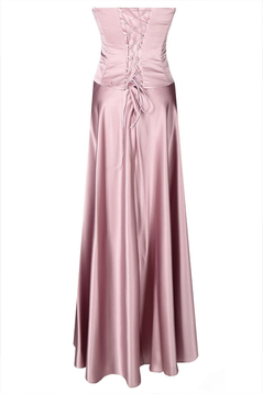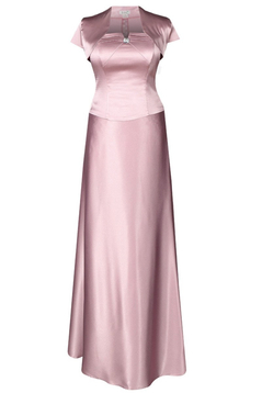 Szykuje się jakaś wyjątkowa impreza, bal karnawałowy a może wieczór panieński w określonej atmosferze? Długa suknia z satyny gładkiej lekko połyskującej. Bardzo elegancka. Dopasowana góra, gorset wiązany pięknie podkreśli szczupłą talię. Ramiona odkryte. Bolerko w zestawie.