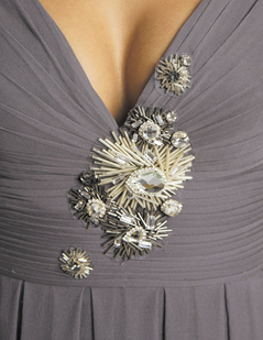 Zestaw sukienka + szal. Skład surowcowy: tkanina zasadnicza: 100% jedwab, podszewka: 100% acetat . Sukienka lekka, zwiewna. Usztywniane miseczki, dekolt trójkątny. Z przodu ramiączka o szerokości 7cm, plecy zakryte. Pod biustem, do talii z przodu i z tyłu drapowany materiał. Na środku przodu ozdoba w postaci cyrkonii, dżetów i nachodzących na siebie pałeczek. Od talii materiał ułożony w drobne kontrafałdy. Z boku zapięcie na kryty suwak. Zestaw polecamy na wesela i inne imprezy okolicznościowe.