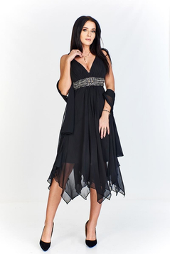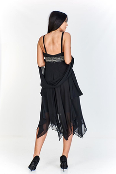 Szukasz wyjątkowej kreacji na karnawał, sylwestra, wesele lub studniówkę?, lekka zwiewna szyfonowa sukienka na podszewce. Spraw by ten wieczór był wyjątkowy a impreza niepowtarzalna. Nie zawsze trafia się nam okazja, by pozwolić sobie na niecodzienny styl i poczuć się jak królowa balu. Idealna dla pań, które lubią  podkreślać swoje atuty, piękny biust czy ramiona. Sukienka pod biustem jest dopasowana. Przyozdobiona cekinami , kamykami i koralikami. Bardzo miły i delikatny w dotyku materiał, nadaje całości lekkości i wytworności. Tkanina gładka mięciutka, kolory matowe. Idealnie dopasowana u góry rozszerzająca się ku dołowi. Nieregularne, niesforne wykończenie. Mocno odkryty dekolt. Całość prezentuje się bardzo zmysłowo i wdzięcznie.