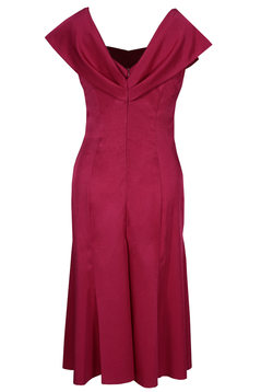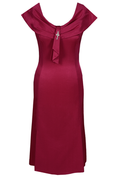 Sukienka wizytowa. Dekolt okrągły wykończony bardzo ozdobnym, opadającym na ramiona, szerokim kołnierzem. Na środku przodu, na kołnierzu znajdują się zakładki. Cięcia pionowe, dodają sylwetce lekkości. Dół poszerzany. Suwak kryty z tyłu. Jest podszewka, ale kończy się w okolicy pasa. Sukienka została uszyta z tkaniny lekko elastycznej, z delikatnym połyskiem. Sukienkę polecamy kobietom dojrzałym, na ważne uroczystości, np. wesela, komunie i wiele innych okazji.
