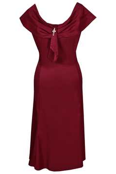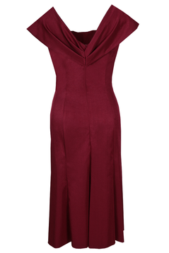 Sukienka wizytowa. Dekolt okrągły wykończony bardzo ozdobnym, opadającym na ramiona, szerokim kołnierzem. Na środku przodu, na kołnierzu znajdują się zakładki. Cięcia pionowe, dodają sylwetce lekkości. Dół poszerzany. Suwak kryty z tyłu. Jest podszewka, ale kończy się w okolicy pasa. Sukienka została uszyta z tkaniny lekko elastycznej, z delikatnym połyskiem. Sukienkę polecamy kobietom dojrzałym, na ważne uroczystości, np. wesela, komunie i wiele innych okazji.