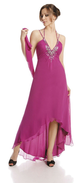Piękna wieczorowa, zwiewna sukienka. Uszyta z jedwabiu. Uwagę przyciąga bogato zdobiony przód, znajdują się tam cekiny, koraliki, błyszczące kamienie, pałeczki i cyrkonie. Razem tworzą oryginalną ozdobę. Na ramiączkach również są naszyte ręcznie koraliki. Na biuście oraz na karczku z tyłu delikatna draperia. Plecy częściowo odkryte. Można sobie pozwolić na niezakładanie biustonosza, ponieważ są poduszki, które świetnie mogą go zastąpić. Sukienka dopasowana jest jedynie w biuście, poniżej jest luźna, doskonale maskując niedoskonałości. Dłuższy tył eksponuje nogi i sprawia że sylwetka wygląda na smuklejszą. Suwak kryty z tyłu. Jest podszewka - 100% acetat. Szal z tego samego materiału jest w zestawie. Sukienkę można włożyć na sylwestra, studniówkę, wesele oraz każdą inną ważną uroczystość.