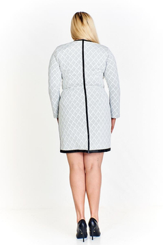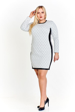 Ołówkowa sukienka. Uszyta została z grubej, ciepłej dzianiny. Dekolt okrągły wykończony skórzaną plisą. Po bokach znajdują się kontrastowe wstawki z modnym ozdobnym lampasem. Na biodrach funkcjonalne kieszenie. Rękawy długie. Na środku tyłu ozdobny, kontrastowy suwak. Można go odpinać zarówno od góry, jak i od dołu. Sukienka codzienna, idealna na zimowe, chłodne dni. Została zaprojektowana z myślą o kobietach, w różnym wieku.