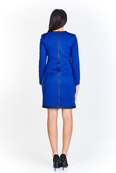Ołówkowa sukienka. Uszyta została z grubej, ciepłej dzianiny. Dekolt okrągły wykończony skórzaną plisą. Po bokach znajdują się kontrastowe wstawki z modnym ozdobnym lampasem. Na biodrach funkcjonalne kieszenie. Rękawy długie. Na środku tyłu ozdobny, kontrastowy suwak. Można go odpinać zarówno od góry, jak i od dołu. Sukienka codzienna, idealna na zimowe, chłodne dni. Została zaprojektowana z myślą o kobietach, w różnym wieku.