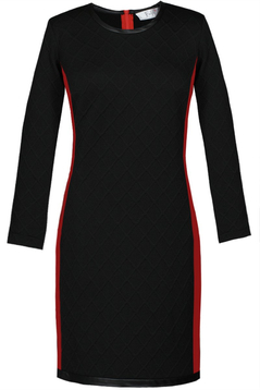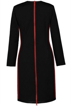 Ołówkowa sukienka. Uszyta została z grubej, ciepłej dzianiny. Dekolt okrągły wykończony skórzaną plisą. Po bokach znajdują się kontrastowe wstawki z modnym ozdobnym lampasem. Na biodrach funkcjonalne kieszenie. Rękawy długie. Na środku tyłu ozdobny, kontrastowy suwak. Można go odpinać zarówno od góry, jak i od dołu. Sukienka codzienna, idealna na zimowe, chłodne dni. Została zaprojektowana z myślą o kobietach, w różnym wieku.