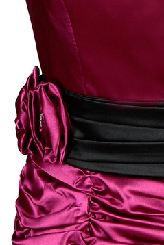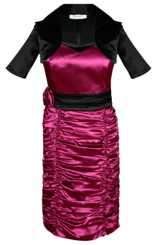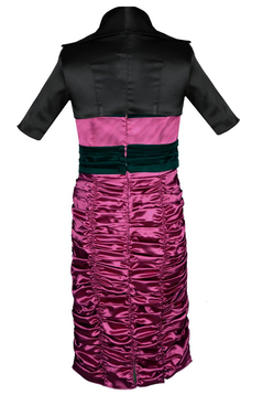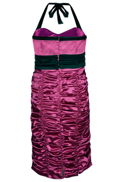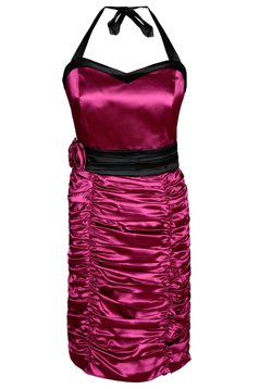 Wizytowa sukienka. Model uszyty został z satyny. Jest to delikatnie elastyczna tkanina z połyskiem. Bardzo miła w dotyku. Zawiązywana na szyi. Dekolt sercowe karo. Sukienka jest dopasowana. Odcięta w talii. Pasek zapinany na małe guziczki. Dół bardzo marszczony, tworzą się poziome fale. Z tyłu suwak kryty, oraz niewielkie pęknięcie ułatwiające chodzenie. W komplecie brak bolerka. Sukieneczka idealna na różnego rodzaju uroczyste wyjścia, np. wesela, komunie i wiele innych okazji.