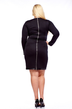 Ołówkowa sukienka. Uszyta została z grubej, ciepłej dzianiny. Dekolt okrągły wykończony skórzaną plisą. Po bokach znajdują się kontrastowe wstawki z modnym ozdobnym lampasem. Na biodrach funkcjonalne kieszenie. Rękawy długie. Na środku tyłu ozdobny, kontrastowy suwak. Można go odpinać zarówno od góry, jak i od dołu. Sukienka codzienna, idealna na zimowe, chłodne dni. Została zaprojektowana z myślą o kobietach, w różnym wieku.