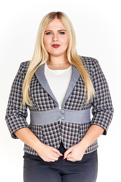 Szykuje się jakaś specjalna okazja, impreza rodzinna, wesele? Piękny żakiet -klasyka elegancji. Z charakterystycznym, kontrastowym wzorem. Kołnierz, mankiety i pas w geometryczny deseń. Bardzo elegancki wizytowy styl. Zapinany na dwa guziczki. Żakiet to Efektowny element naszej garderoby. W połączeniu z sukienką lub spódnicą możesz stworzyć szykowny powiew stylizacji na wiosnę/lato.