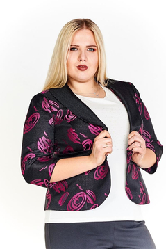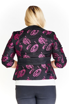 Szykuje się jakaś specjalna okazja, impreza rodzinna, wesele? Piękny żakiet -klasyka elegancji. Z charakterystycznym, kontrastowym wzorem. Kołnierz, mankiety i pas w geometryczny deseń. Bardzo elegancki wizytowy styl. Zapinany na dwa guziczki. Żakiet to Efektowny element naszej garderoby. W połączeniu z sukienką lub spódnicą możesz stworzyć szykowny powiew stylizacji na wiosnę/lato.