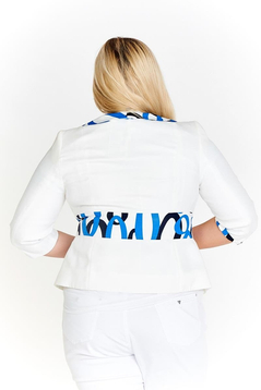 Szykuje się jakaś specjalna okazja, impreza rodzinna, wesele? Piękny żakiet -klasyka elegancji. Z charakterystycznym, kontrastowym wzorem. Kołnierz, mankiety i pas w geometryczny deseń. Bardzo elegancki wizytowy styl. Zapinany na dwa guziczki. Żakiet to Efektowny element naszej garderoby. W połączeniu z sukienką lub spódnicą możesz stworzyć szykowny powiew stylizacji na wiosnę/lato.