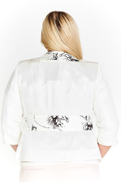 Szykuje się jakaś specjalna okazja, impreza rodzinna, wesele? Piękny żakiet -klasyka elegancji. Z charakterystycznym, kontrastowym wzorem. Kołnierz, mankiety i  pas w geometryczny deseń. Bardzo elegancki wizytowy styl. Zapinany na dwa guziczki. Żakiet to Efektowny element naszej garderoby. W połączeniu z sukienką lub spódnicą możesz stworzyć szykowny powiew stylizacji na wiosnę/lato.