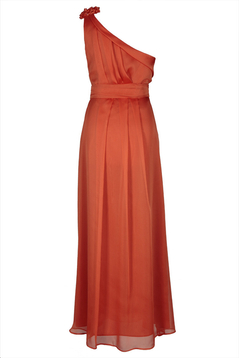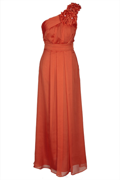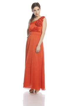 Asymetryczna, rozkloszowana, maxi sukienka, wzbudzająca podziw dosłownie wszystkich. Uszyta z dwutonowego szyfonu. Jest to niezwykle wyrafinowana tkanina. Przezroczysta, w dotyku bardzo delikatna, przypominająca szyfon jedwabny. Jest podszewka. Zakładana na jedno ramie, dołączone jest zapasowe cienkie ramiączko, które można doszyć do sukienki lub wykorzystać do biustonosza, zamiast niezbyt eleganckiego silikonowego. Talia zaakcentowana paskiem. Na przodzie i tyle zarówno na karczku jak i pod paskiem są szerokie miękko układające się zakładki. Charakteru dodają 3 bogate, różnej wielkości kwiaty, uszyte z tego samego materiału, dodatkowo ozdobione perełkami. Suwak kryty z boku. Jeśli chcesz zostać królową wieczoru, ta sukienka jest dla Ciebie. Polecamy na wesele, studniówkę lub Sylwestra.