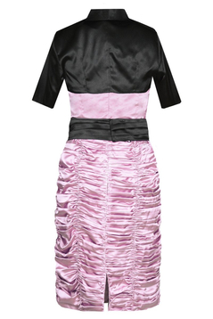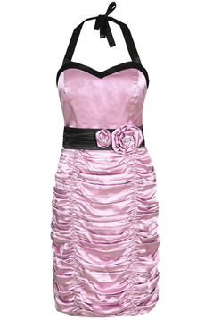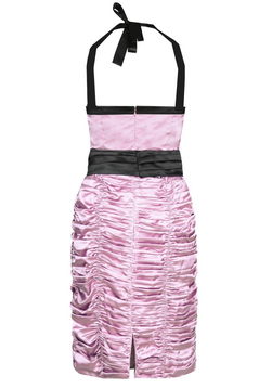Wizytowa sukienka. Model uszyty został z satyny. Jest to delikatnie elastyczna tkanina z połyskiem. Bardzo miła w dotyku. Zawiązywana na szyi. Dekolt sercowe karo. Sukienka jest dopasowana. Odcięta w talii. Pasek zapinany na małe guziczki. Dół bardzo marszczony, tworzą się poziome fale. Z tyłu suwak kryty, oraz niewielkie pęknięcie ułatwiające chodzenie. W komplecie brak bolerka. Sukieneczka idealna na różnego rodzaju uroczyste wyjścia, np. wesela, komunie i wiele innych okazji.