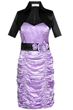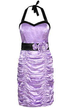 Wizytowa sukienka. Model uszyty został z satyny. Jest to delikatnie elastyczna tkanina z połyskiem. Bardzo miła w dotyku. Zawiązywana na szyi. Dekolt sercowe karo. Sukienka jest dopasowana. Odcięta w talii. Pasek zapinany na małe guziczki. Dół bardzo marszczony, tworzą się poziome fale. Z tyłu suwak kryty, oraz niewielkie pęknięcie ułatwiające chodzenie. W komplecie brak bolerka. Sukieneczka idealna na różnego rodzaju uroczyste wyjścia, np. wesela, komunie i wiele innych okazji.