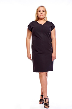 Sukienka dopasowana jedynie w biodrach, w pasie oraz biuście delikatnie luźna. Sukienka posiada szpiczasty dekolt, dzięki czemu świetnie podkreśla biust. Na przodzie sukienka posiada zaszewki piersiowe, które dodatkowo modelują piersi. Sukienka sprawdzi się u kobiet w każdym wieku. Fason bardzo uniwersalny, sprawdzi się na co dzień, do pracy biurowej lub na różnego rodzaju spotkania w gronie rodziny, czy znajomych.