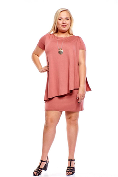 Dwuwarstwowa sukienka. Spód to prosta dopasowana tkanina. Doskonale opina każdą figurę, wierzch jest luźny i asymetryczny, z lewej, krótszej strony niezszyty. Układa się bardzo efektownie, tuszuje niedoskonałości sylwetki. Bardzo wygodna, nie krępuje ruchów. Dekolt w kształcie łódki, rękaw zwykły, krótki. Sukienka uszyta została z bardzo elastycznej, lejącej dzianiny – wiskozy. Skład surowcowy: 90% wiskoza, 10% elastan. Sukienkę polecamy kobietom w każdym wieku, na co dzień. Po dobraniu odpowiednich dodatków można stworzyć bardzo udaną stylizację na bardziej uroczyste wyjścia. Jeśli chcesz wyglądać wyjątkowo i czuć się komfortowo to ta sukienka jest właśnie dla Ciebie.