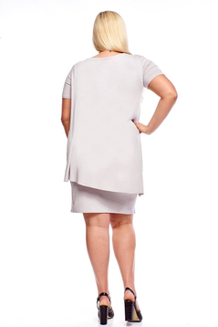 Dwuwarstwowa sukienka. Spód to prosta dopasowana tkanina. Doskonale opina każdą figurę, wierzch jest luźny i asymetryczny, z lewej, krótszej strony niezszyty. Układa się bardzo efektownie, tuszuje niedoskonałości sylwetki. Bardzo wygodna, nie krępuje ruchów. Dekolt w kształcie łódki, rękaw zwykły, krótki. Sukienka uszyta została z bardzo elastycznej, lejącej dzianiny – wiskozy. Skład surowcowy: 90% wiskoza, 10% elastan. Sukienkę polecamy kobietom w każdym wieku, na co dzień. Po dobraniu odpowiednich dodatków można stworzyć bardzo udaną stylizację na bardziej uroczyste wyjścia. Jeśli chcesz wyglądać wyjątkowo i czuć się komfortowo to ta sukienka jest właśnie dla Ciebie.