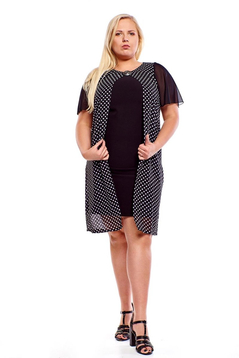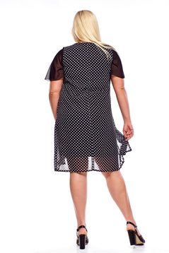 Dopasowana sukienka o prostym kroju, delikatnie taliowana. Do całości przyszyta szyfonowa narzutka - wzór: małe lub duże kropki. Sukienka jest idealna na upały, ale również dobrze sprawdzi się na przeróżne okazje. Ze szpilkami stworzysz niebanalną stylizację.
